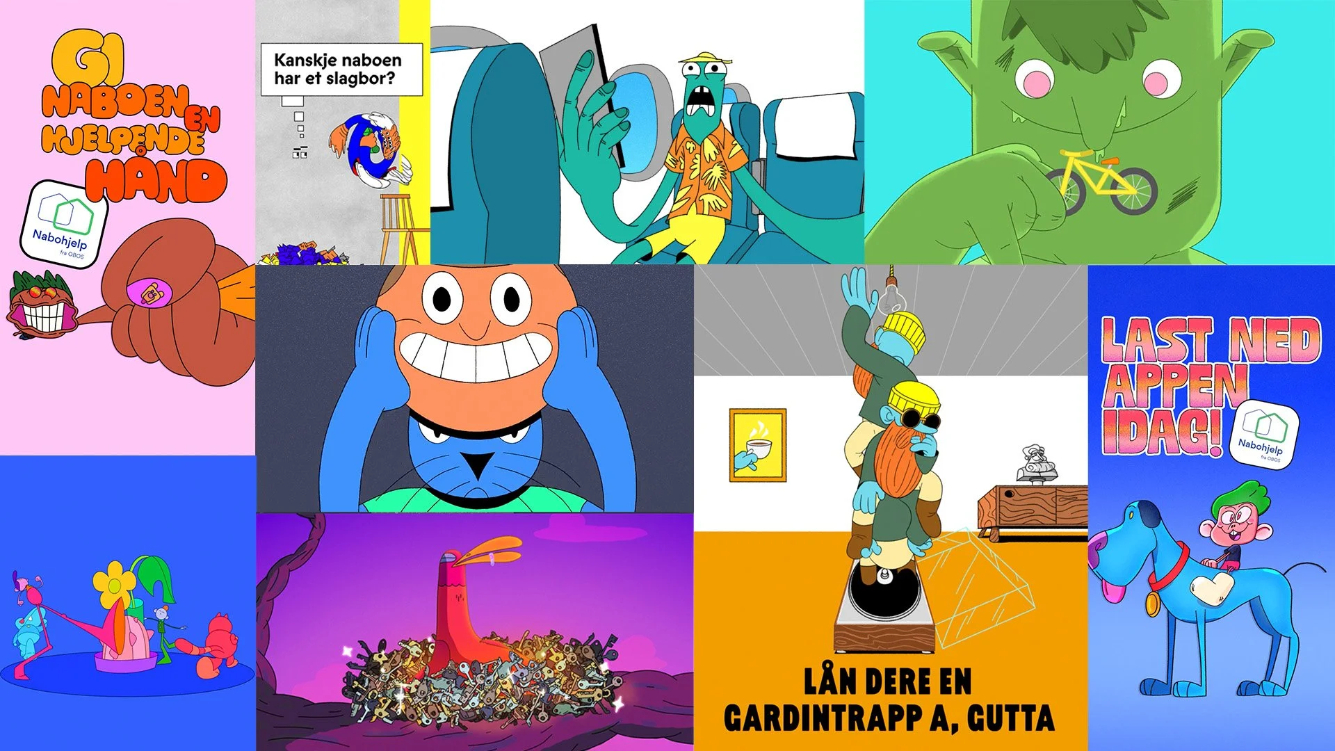 OBOS, Nordens største boligbyggelag, ønsket å promotere sin nye app i sosiale medier: Nabohjelp – appen som gjør det enklere å be naboen om hjelp. Vi laget en serie korte animerte filmer, hver med sitt lille problem, men alle med den samme løsningen: last ned appen og få hjelp av naboen din.